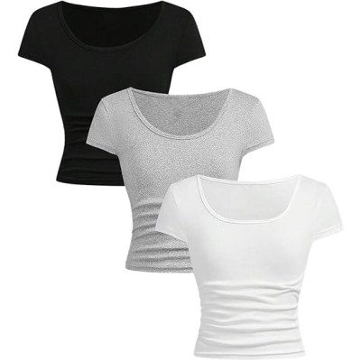 Girl's Short Sleeve T Shirts 3 Piece Basic Scoop Neck Tees Slim Fit Casual Summer Tops