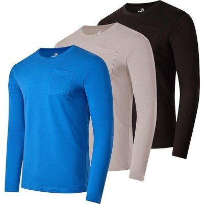 3 Pack: Men's Cotton Performance Long Sleeve Crew Neck Pocket T-Shirt Athletic Top (Available in Big & Tall)