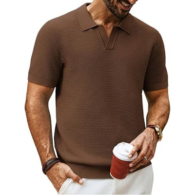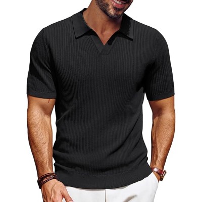Mens Polo Shirts Short Sleeve V Neck Knit Textured Polo Knitted Golf Shirt