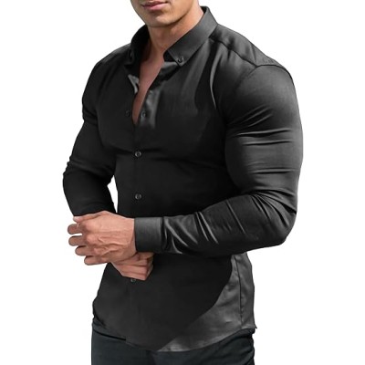 Men's Muscle Dress Shirts Slim Fit Stretch Long&Short Sleeve Casual Button Down Shirt