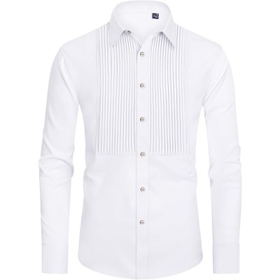 Men's Tuxedo Shirt Formal Dress Shirt Pleated Long Sleeve Button Down Shirts for Prom Party Wedding