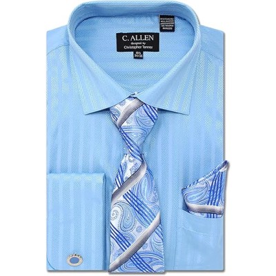 Men's Solid Striped Herringbone Regular Fit French Cuffs Dress Shirts with Tie Hanky Cufflinks Combo