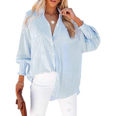 Womens Smocked Cuffed Striped Boyfriend Shirt Casual Collar Long Sleeve Oversized Button Down Blouse Tops with Pocket Shirred